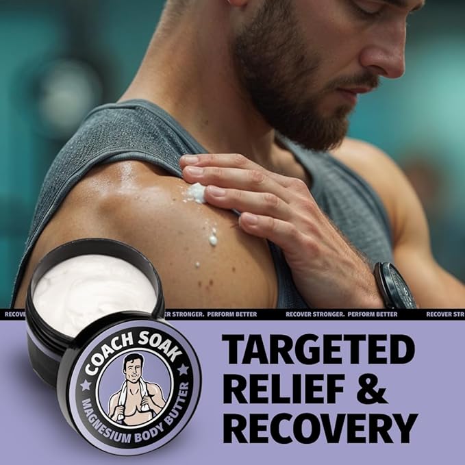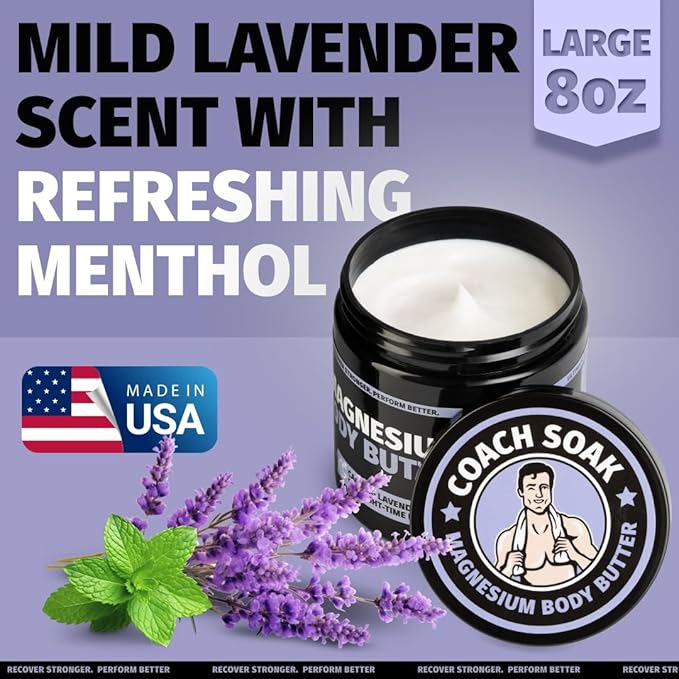 Coach Soak Nighttime Magnesium Body Butter, Thick Cream with High Magnesium Concentration, Soothes Muscles Overnight, Shea Butter, Almond Oil & Lavender, Large Size (8oz)