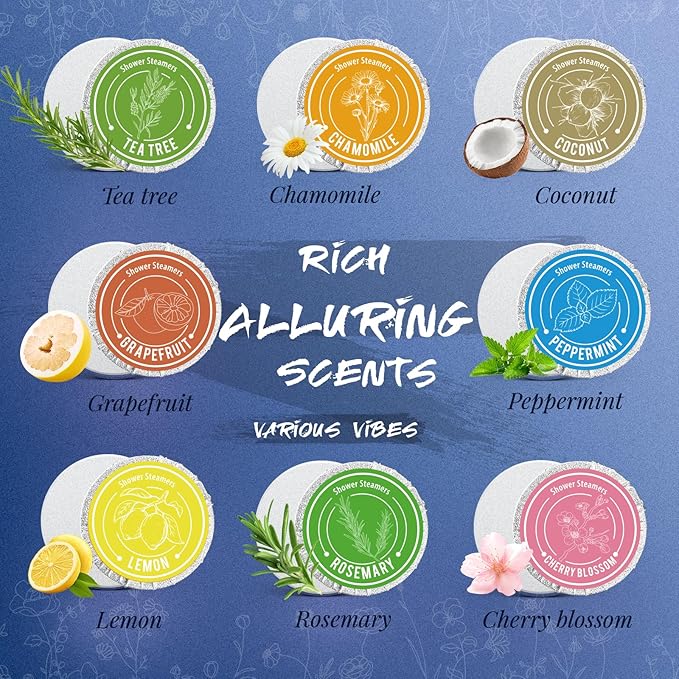- Alluring Scentswith Rich Layers: The shower steamer set features a rich array of alluring scents, offering various options to meet your needs. Enjoy fragrances with multi-layers like Rose, Lavender, Chamomile, Eucalyptus, Peppermint, Tea Tree, Lemon, Citrus, Jasmine, Pineapple, Cucumber, Lemongrass, Rosemary, Cherry Blossom, Grapefruit, and Coconut.