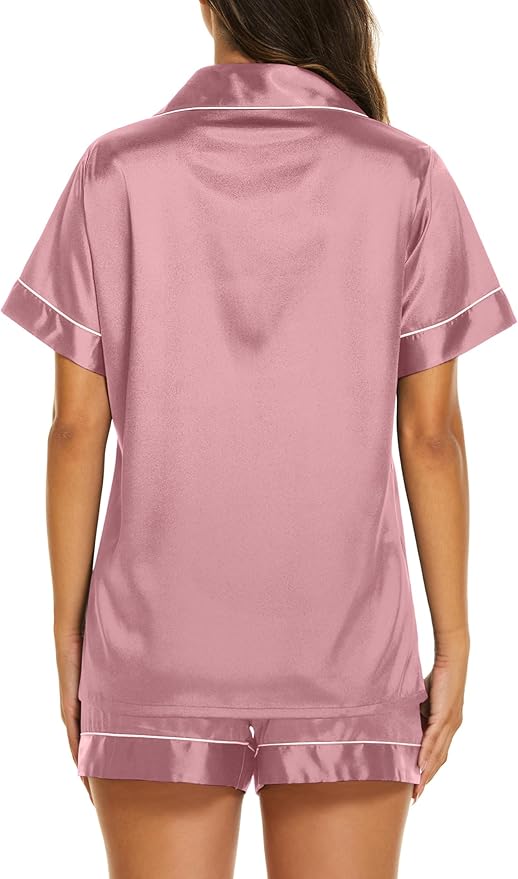 - Elegant design:Short sleeve pajama tops, button down front,notch lapel collar and one chest pocket.Matching pajama shorts for women with stretchy elastic waist that fits for any body size.Lightweight and Breathable,perfect for sleeping, lounging, or morning coffee in effortless grace