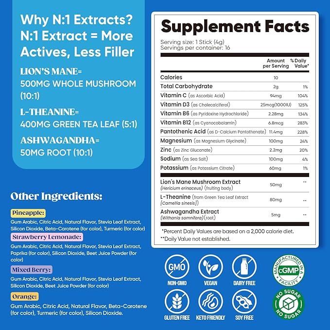 Venture Pal Calming Powdered Drink Mix, Magnesium Glycinate, Ashwagandha, L-Theanine,Vitamin D, Lions Mane, Sugar Free Magnesium Supplement Blend for Relax & Focus, Non GMO, Vegan, On The Go