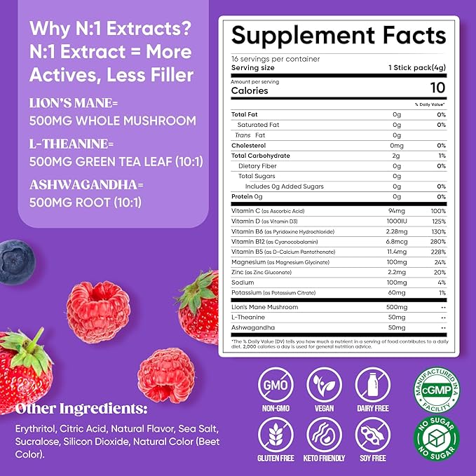 - SUPERIOR FORMULA: Unlike many magnesium supplements, our Magnesium Glycinate Powder includes L-Theanine for brain health, Ashwagandha to relieve stress, and Vitamin D for immune support, plus Lion's Mane for cognitive function and essential vitamins B5, B6, B12 and C