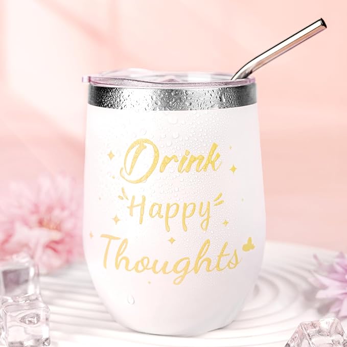 - 【Insulated Tumbler with Lid】The 12oz insulation vacuum tumbler is made of 304 food grade stainless steel material with double wall vacuum insulated technology, can preserve beverage temperature up to 12h for cold & 9h for hot, great for iced coffee, tea, wine, juice, etc.The shell is printed with the word "Drink Happy Thoughts", it's best gifts for women