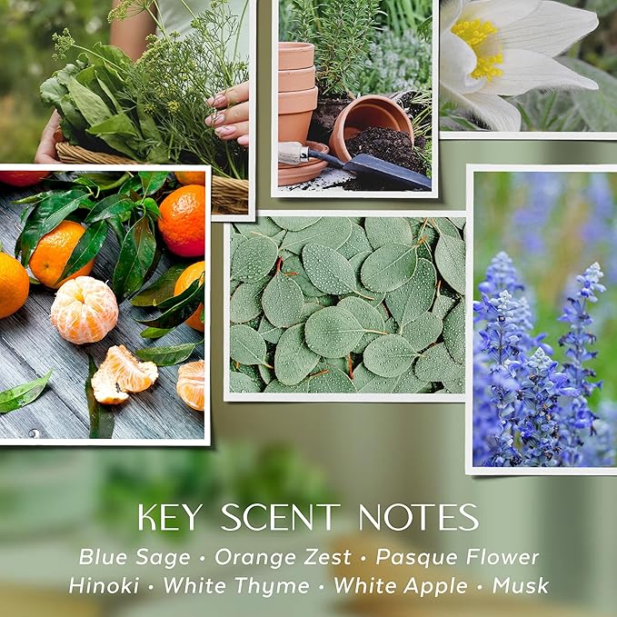 - WILD SAGE – A FRESH GARDEN STROLL: Reconnect with nature as you bask in the refreshing essence of a sunlit garden walk, with this invigorating blend of blue sage, white thyme, hinoki, and orange zest. Like the sensation of running your hands through fresh herbs, this sage green colored candle evokes the purity of spring and summer, creating a peaceful, earthy ambiance that brings the outdoors inside.