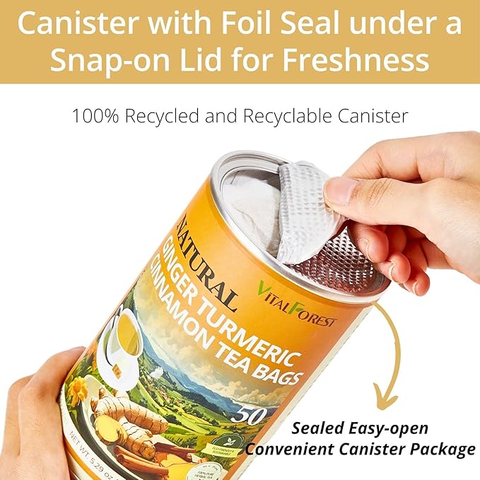 - [ Eco-Conscious Tea Bags & Canister ]- Our best turmeric tea bags are made from paper bag, they contain no strings, wrapping, staples, adhesive, bleach, or dyes. Enjoy pure, high-quality mix curcuma tea in biodegradable-bags. And special convenient canister with lid. There is a foil protective seal under the lid - easy to remove and useful to keep the tumeric and ginger tea fresh