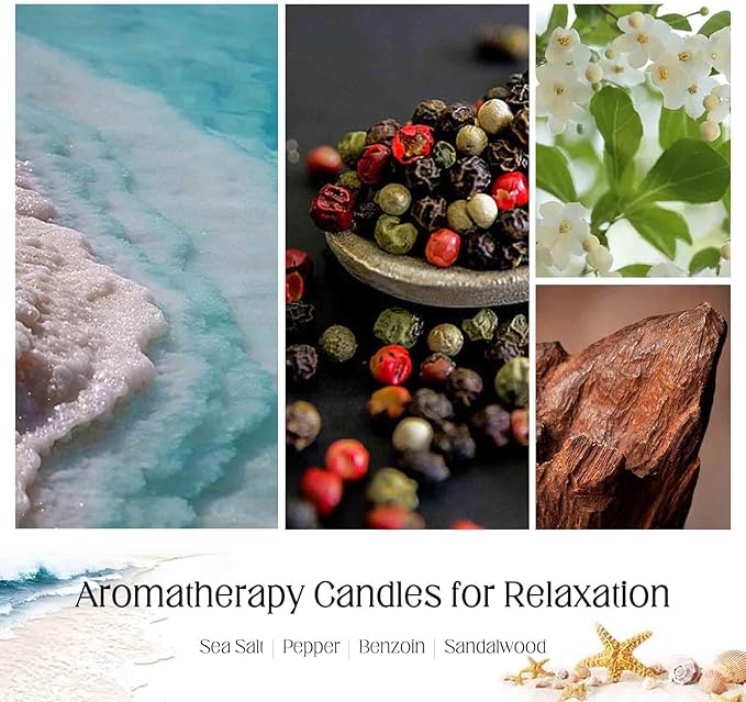 - Perfect Aromatherapy Candles for Relaxation and Stress Relief: Crafted from natural soy wax and infused with a rich blend of Sea salt, Pepper, Benzoin, Sandalwood essential oils, KOTKAS Ocean Breeze candles for home scented provide a soothing, powerful aromatherapy experience. With an impressive 8% essential oil content, just 1-2 hrs of burn time fills your room with a calming, refreshing scent. Ideal for unwinding anxiety after a long day and transforming any space into a peaceful retreat