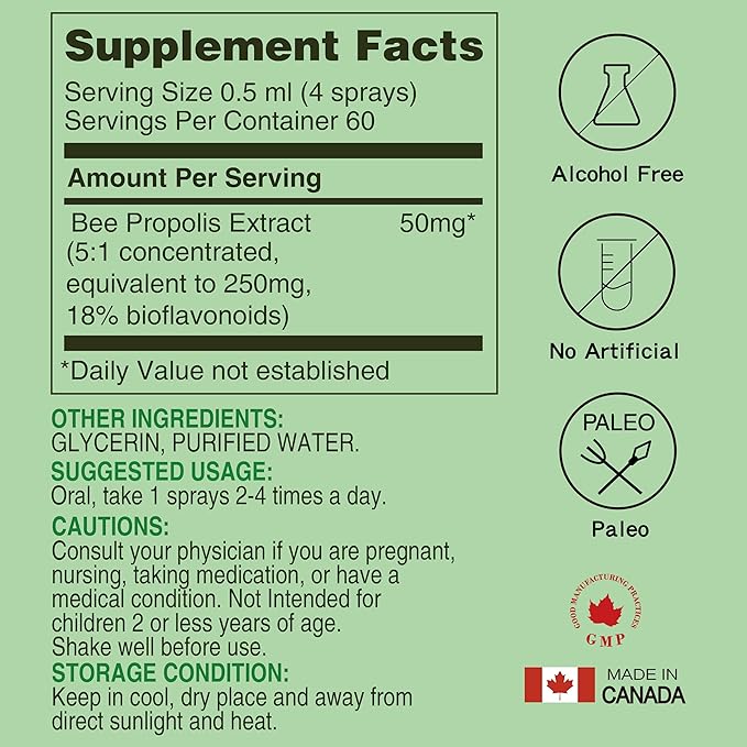 - Clean Ingredients: No Unwanted Additives – Made with propolis extract, glycerin, and purified water; free from alcohol, artificial colors, preservatives, and refined sugar