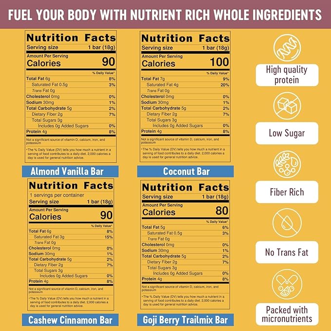 - Pure & Natural Ingredients: Our protein bars are made from whole, steering clear of artificial powders. Experience rich flavor and functionality without any compromise—just real ingredients with #NOWEIRDSTUFF. Each bar measures 3" x 2" x 0.5" and weighs 18 grams (0.6 oz).