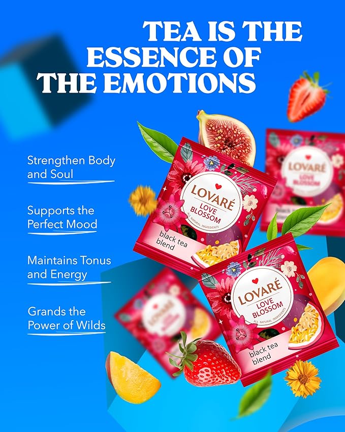 Individually Wrapped Tea Bags By Lovare Made in Ukraine - Black and Green, Floral, Passion Fruit, Huchlebbery Herbal Set with Flowers - Gift Box For Blooming Tea Lovers Men & Women - 48 g (24 tea bags x 2 g each) (Love Blossom)