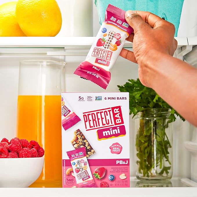 - PERFECT BAR MINI PEANUT BUTTER AND JELLY PROTEIN BAR: Eighteen 1.05-oz protein bars with cashew butter and organic peanut butter, 100% real fruit spread, toasted oats, organic honey, whole food protein, and 20+ superfoods