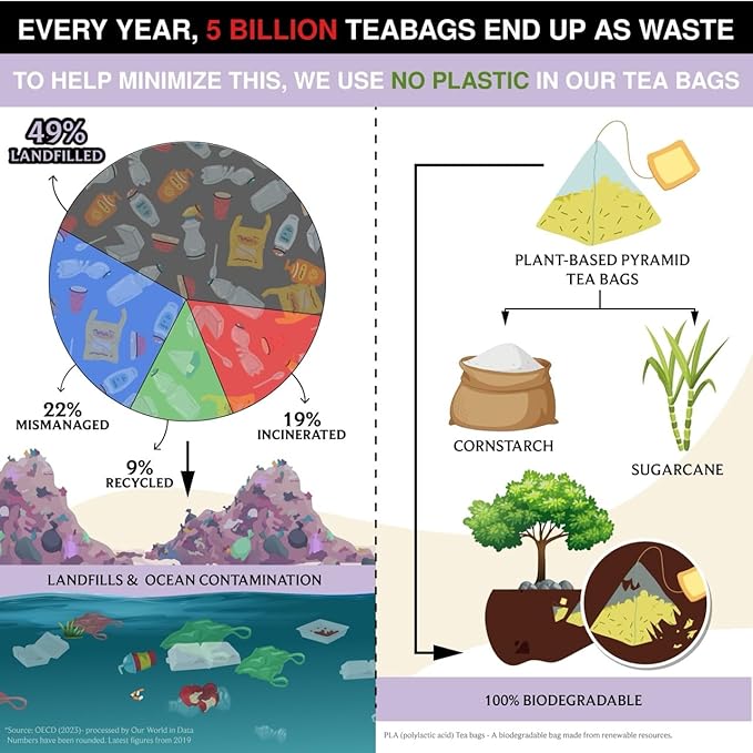 - CONVENIENTLY PACKED - The tea comes packed in pyramid bags that allow for a more fuller and intense brew as it provides ample space for the tea leaves to unfurl and infuse. We have removed individual sachets from our packaging to reduce wastage, instead the pyramid bags are packed inside a resealable pouch that can be conveniently stored or carried as a travel tea.