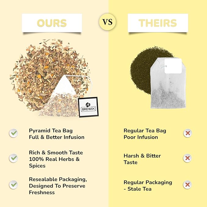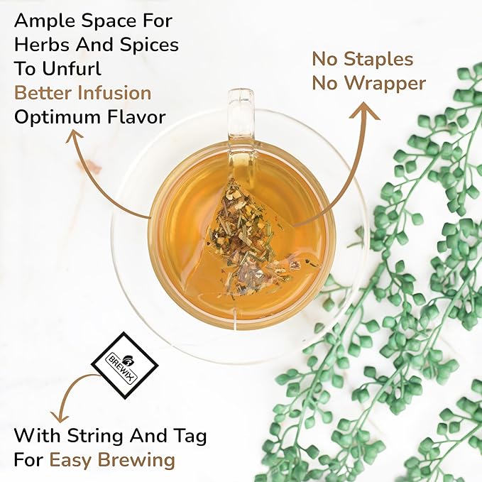 - CONVENIENTLY PACKED - The tea comes packed in pyramid bags that allow for a more fuller and intense brew as it provides ample space for the tea leaves to unfurl and infuse. We have removed individual sachets from our packaging to reduce wastage, instead the pyramid bags are packed inside a resealable pouch that can be conveniently stored or carried as a travel tea.