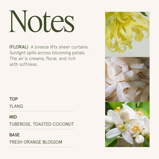 - CHAMPS DE TUBEROSE: A lush and alluring fragrance that opens with the delicate allure of bergamot, jasmine petals, gardenia, and ylang, leading into a heart of creamy Tuberose and Toasted Coconut, while resting on a warm base of musk and fresh orange blossom