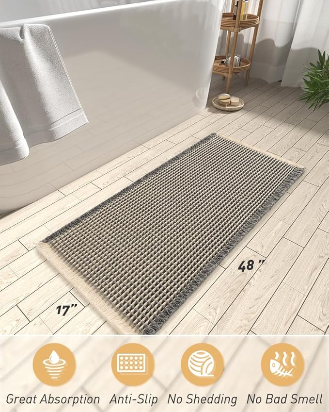 - Great Water Absorption: Double layer of deep waffle texture absorbs water instantly and more breathable. In addition, the yarns we use is inherently absorbent-it absorb water like crazy. This absorbent bath mat can soak up the water and keep your floor dry like a giant sponge, and protect your feet from the cold floor.