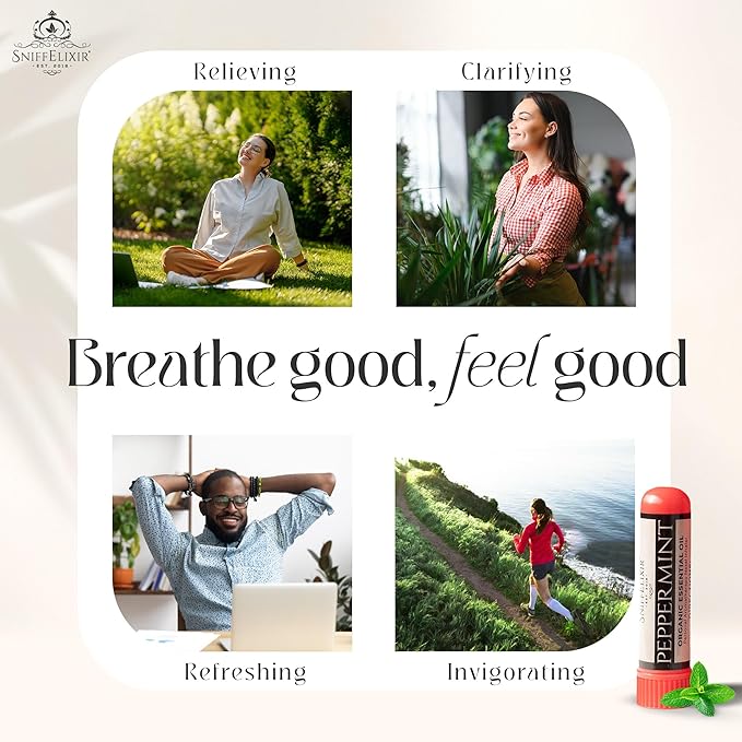 - HEADACHE & MIGRAINE RELIEF: The SniffElixir Peppermint Inhaler Nasal Sticks (2-Pack) are designed to help alleviate headaches and migraines. The menthol content in peppermint oil for headaches provides a cooling effect that may help relax tense muscles and reduce inflammation. Can be use for migraine inhaler nose sniffer stick or headache relief products.