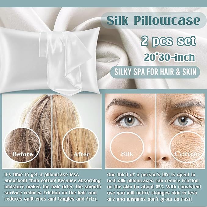 - There's one special item in the gift basket: a pair of silk pillowcases! A solution to her waking up in the morning with dry skin and tangled hair, every woman needs a couple of silk pillowcases! As a less-absorbent fabric than cotton, it relieves dry skin and hair, and the silky touch reduces friction on the skin and hair, which slows down the growth of wrinkles and reduces split ends
