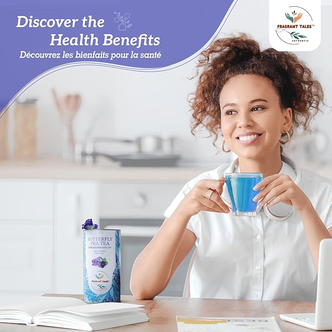 - Fragrant Tales Blue Butterfly Pea Tea is a naturally caffeine-free, preservative-free herbal tea known for its beautiful blue color and mild, earthy taste. Unlike highly aromatic teas, butterfly pea flower has a delicate flavor and subtle aroma that some find refreshing and grounding. Its color-changing properties are an added delight; just add lemon or lime to transform your tea from blue to purple.