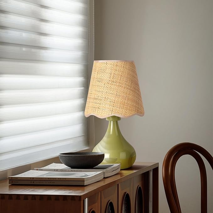 Green Cute Small Boho Table Lamp for Bedroom Bedside, Green Bedroom Lamps for Nightstand, Small Scalloped Rattan Shade Table Lamps for Small Spaces for Bedroom, Home Office, Living Room, Kids Dorm