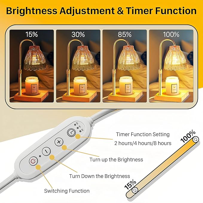 - 【Adjustable Height & Timing Function】The free lift holder can be easily adjusted in height, suitable for all types of candles, and you can also control the melting speed of the candle by adjusting the height. In addition, this candle warmer can be timed to turn off in 2 hours/4 hours/8 hours, so you don't have to worry about the time being too long while enjoying the scent, and the timer function is designed to allow you to enjoy the peace and quiet of the candle scent.