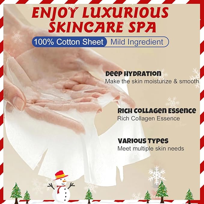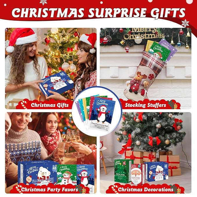 - Perfect for Stocking Stuffers:These Christmas face masks skincare are perfect stocking stuffers,whether it's stuffing them into Christmas stockings or giving them to friends,family or women,they are all ideal Christmas gifts.Sharing these facial mask with friends will leave them a good memory