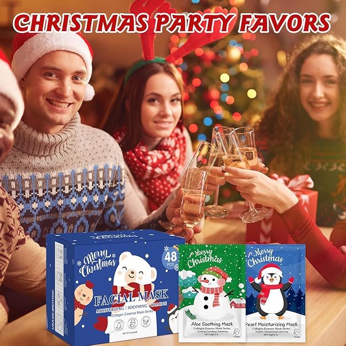 - Face Masks Skincare:Our 48 Pack Christmas face masks skincare set have a total of 6 different scents-pearl,honey,lavender,aloe,tomatoe.There are beautiful Christmas patterns on the package of facial mask,facial mask is very suitable for Christmas theme,they are the Ideal bulk Christmas gifts