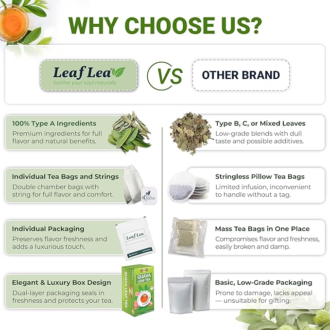 - 100% Pure Guava Leaves β Our LeafLea Guava Leaf Tea Bags are made from carefully handpicked guava leaves, 100% natural and free from artificial additives, sugar, caffeine, and gluten. These guava leaf tea bags are perfect for those looking for a pure and healthy tea experience, offering a natural way to support overall health and wellness.
