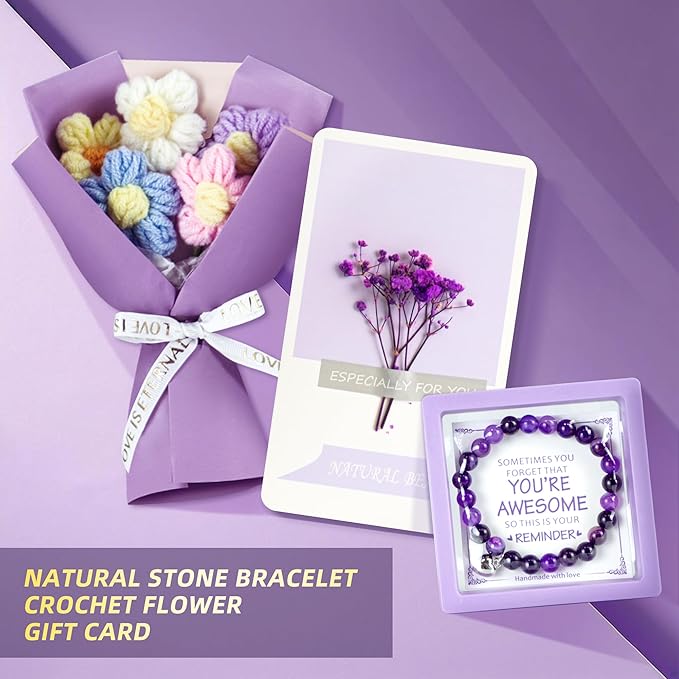 - NATURAL STONE BRACELET & CROCHET FLOWER: The bracelet is made of 8 mm natural agate stone, which can bring her luck, wisdom and strength. The elastic rope fits most wrists. A bouquet of delicate handmade crochet flower create a warm moment for her and leave her with an impressive holiday memory.