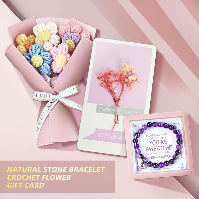 - NATURAL STONE BRACELET & CROCHET FLOWER: The bracelet is made of 8 mm natural agate stone, which can bring her luck, wisdom and strength. The elastic rope fits most wrists. A bouquet of delicate handmade crochet flower create a warm moment for her and leave her with an impressive holiday memory.