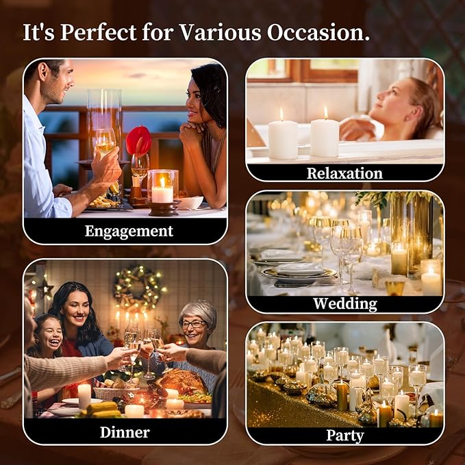 - WIDE USE: Widely applied to Wedding table, Birthdays, Christmas decorations, home decorations, baby shower centerpieces, hotel spa candles, and even as religious candles. As candles burn for a long time, they can be reused many times.