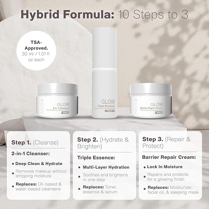 - SIMPLIFIED 3-STEP MINI SKIN CARE (PATENT PENDING): This travel size skincare set combines a complete 10 Steps Korean Skincare routine to three powerful hybrid formulas: cleanser, essence, and cream, simplifying routines with innovation and convenience. Perfect for busy lifestyles.