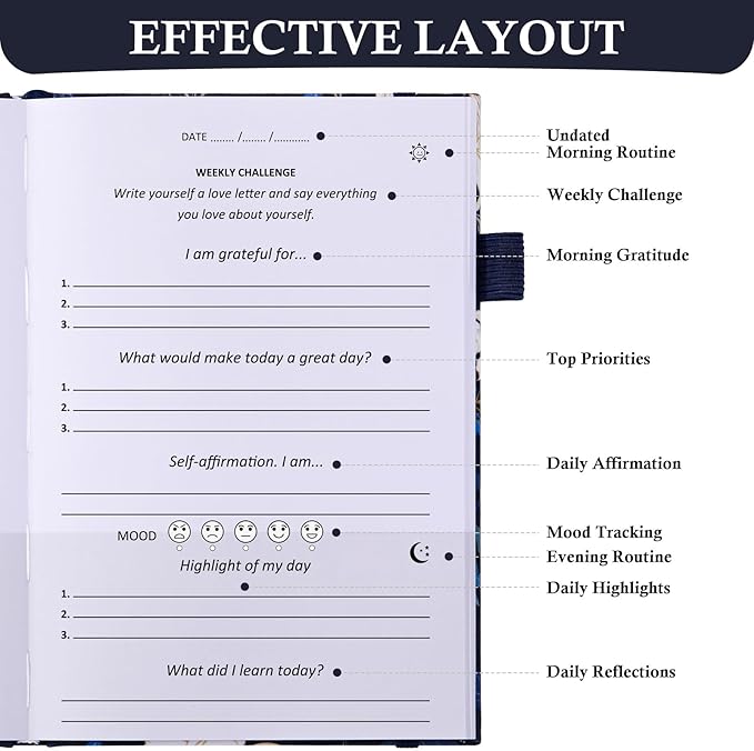 - Effective Layout - The Comkiso undated gratitude positivity journal with prompts is easy to follow. Start your day with appreciation and end it with deep reflection. The morning routine includes inspiring quotes, gratitude, top priorities, daily affirmations, and weekly challenges. The evening routine includes mood tracking, daily highlights, and self-reflection.