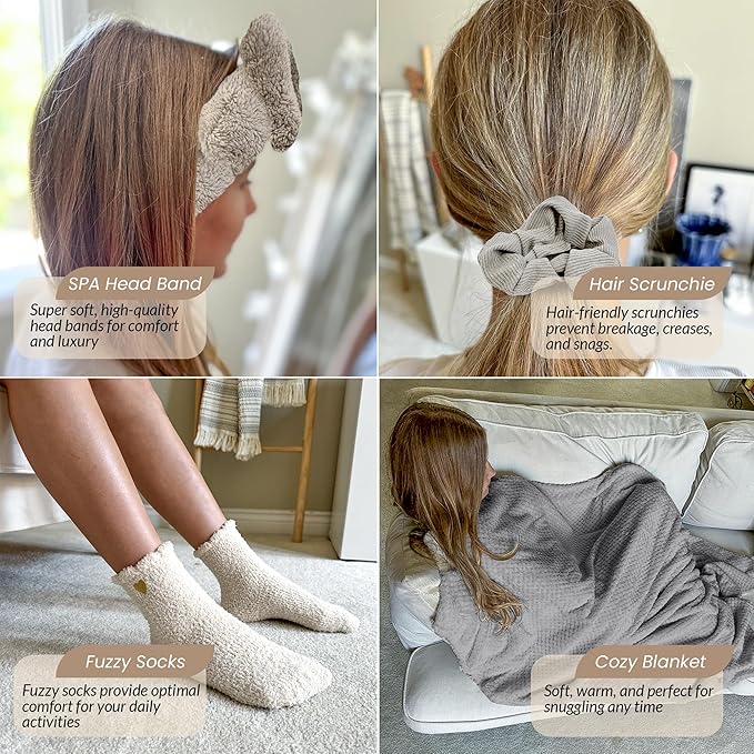 - Surround Yourself In Comfort: The self care gift set for women comes with a 50" x 70" knitted fleece blanket along with fuzzy socks and hair scrungie to offer fuzzy warmth and comfort throughout the year while being easy to clean and maintain for day-to-day use
