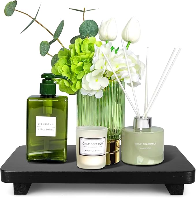 Black Bathroom Counter Organizer Tray Wood Riser Kitchen Countertop Trays Dish Soap Dispenser Holder for Bathroom Decor Wooden Pedestal Display Stands Kitchen Sink Accessories Vanity Tray