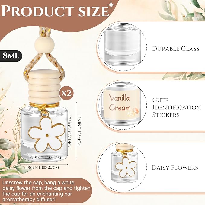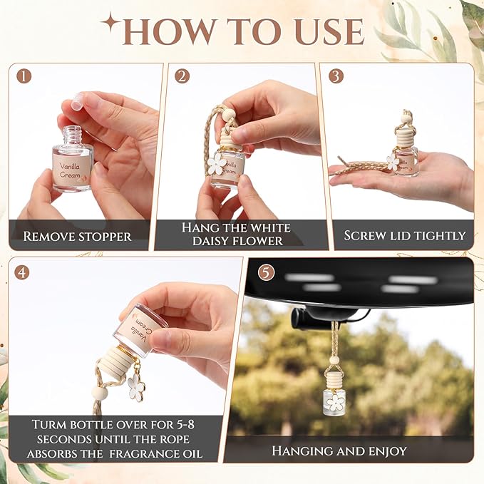 - What You Will Receive: you will get 2 hanging car aromatherapy and 2 white daisy ornaments. first, remove stopper; second, hang the white daisy flower; third, screw lid tightly; and then turn bottle over for 5-8 seconds until the rope absorbs the fragrance oil; finally, hanging and enjoy