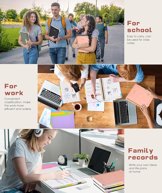 - 【5 Adjustable Dividers with 8 Tabs】Our 5 subject notebook include 5 removable plastic dividers, flexible and durable so you can move and organize them as your wish. It can be divided into 5 sections in total, which had enough features to keep organized on different subjects, instead of piles of random spiral notebooks that will slimmed your backpack down a ton! Come with 8 self-adhesive labels that separate information and make it easy to find categories to help organize your notes effectively.