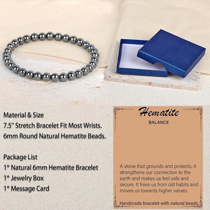 - Natural Hematite Healing Bracelet: Beads size 6mm. The length of the elastic handmade bracelet is 7.5 INCHES. No metal design good for sensitive skin.