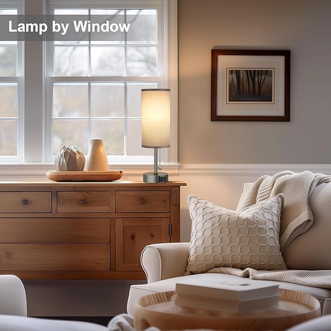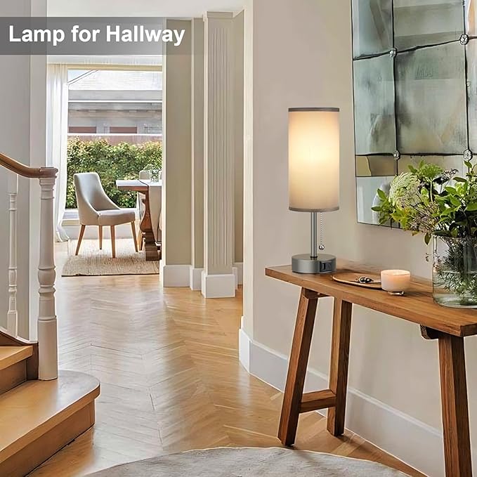 - 1. 3-Color Temperature Bedroom Lamp - The small grey table lamp for bedroom features with stylish pull-chain to make quick changes to 3 different level brightness (3000K, 4000K, 5000K ). Simply give the string a little tug when you want the nightstand lamp On/Off, brighter/dimmer, 3000K for Used as a night lamp, 5000K for reading/study