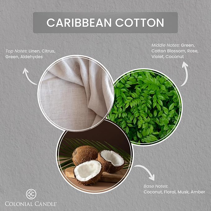 - Caribbean Cotton: The Caribbean Cotton candle opens with bright notes of citrus, green, and aldehydes, followed by a delicate heart of cotton blossom, rose, violet, and coconut, and is anchored by a warm base of coconut, floral notes, musk, and amber, creating a refreshing and soothing tropical aroma perfect for any space.