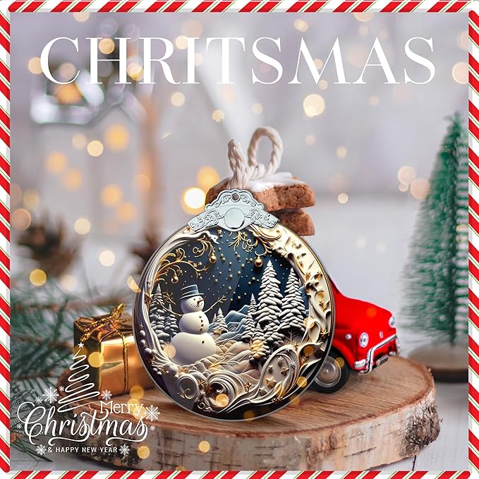 - ā Charming Snowman Scene ā A joyful snowman surrounded by snowy pine trees and twinkling stars, bringing warmth and cheer to your Christmas tree.