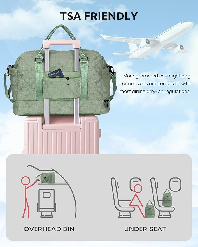 - 【Airplane Friendly Travel Bag】This Initial bag is designed to be the nice carry-on compliant bag for airline travel. It fits in the overhead compartment or under the seat as a personal item during flights. The back of the travel bag has a luggage strap that can be inserted and secured onto the handle of a suitcase, freeing your hands during business trips. It also features a back zipper pocket for storing your smartphone, ID, or passport.