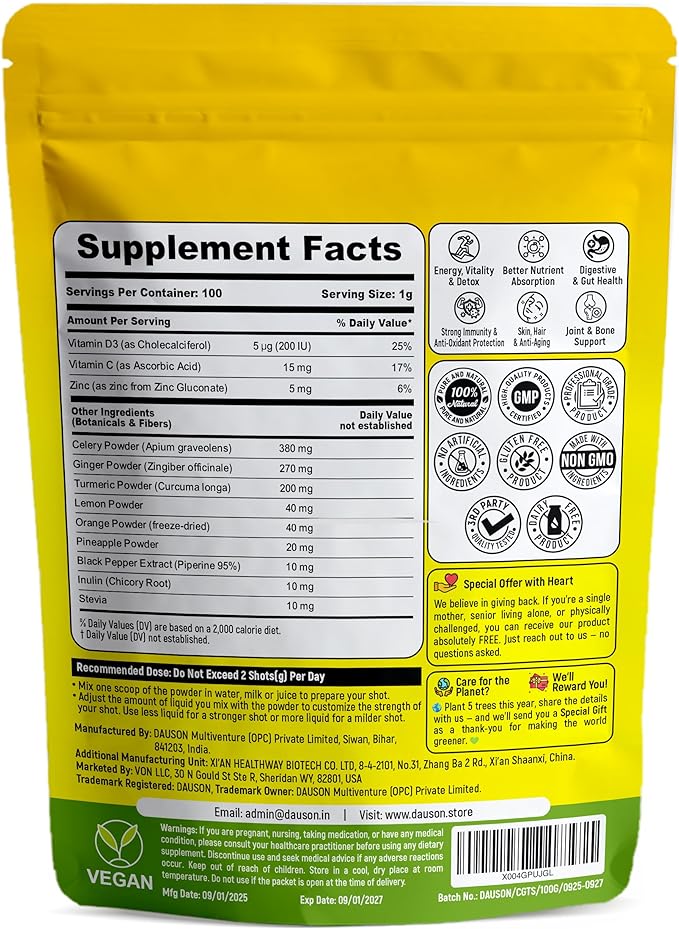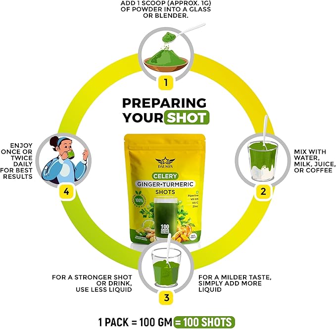 - 🧴 CLEAN, VEGAN, AND READY TO MIX: DAUSON'S CELERY GINGER TURMERIC SHOTS are natural, vegan, non-GMO, and gluten-free. Just scoop into water or juice—no refrigeration, no preservatives, just functional ingredients your body will thank you for.