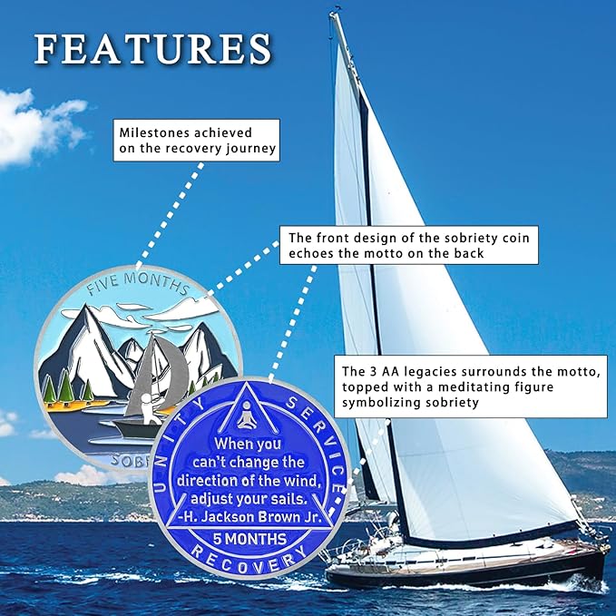 - 【Motivational Sailing Design for Growth】: The front of the 5 month sobriety coin vividly depicts a scene of sailing with the wind, symbolizing the adjustments and resilience needed to steer a sober path. This powerful image of setting your course in alignment with new goals beautifully captures the theme of self-direction and growth during the fifth month of sobriety.
