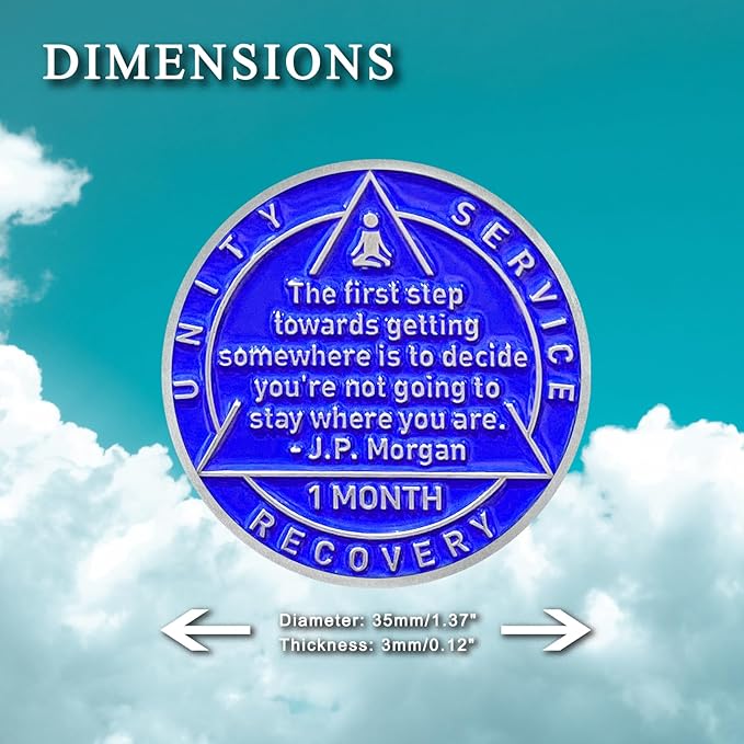 - 【Meaningful AA Emblem and Motto】The reverse side of 30 day sobriety coin displays a deep blue background with the AA triangle symbol, surrounded by the words “UNITY,” “SERVICE,” and “RECOVERY.” At the center is J.P. Morgan’s inspirational motto: “The first step towards getting somewhere is to decide you’re not going to stay where you are,” encouraging you to stay on the path to recovery.