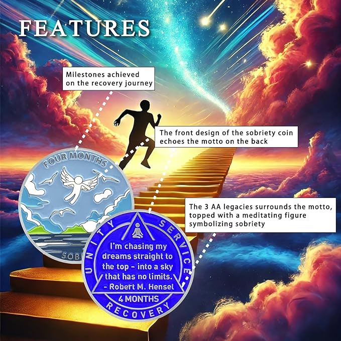 - 【Motivational Words by Robert M. Hensel】Engraved with Robert M. Hensel’s encouraging quote, “I'm chasing my dreams straight to the top—into a sky that has no limits,” the sober coin inspires a mindset of boundless possibilities. These words serve as a motivational beacon, reminding you to pursue your goals without restriction, symbolizing your commitment to personal growth and lasting recovery.
