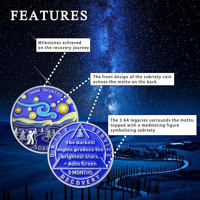 - 【Celebrate 9 Months of Sobriety】Commemorate your nine-month journey with this specially designed sobriety coin as sobriety gift for women and men. The front displays “NINE MONTHS,” marking a significant step in your recovery and symbolizing the strength and resilience you've shown. This coin serves as a powerful reminder of your dedication to a sober life.