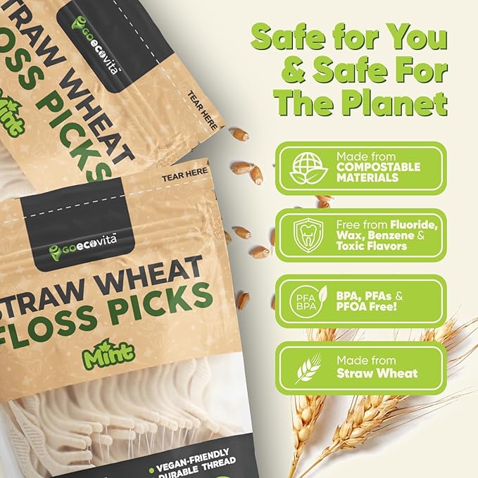 Dental Floss Picks - Straw Wheat Handle Flossers | Thin & Shred-Resistant Thread for Tight Gaps | Flossers for Adults | Gentle on Gums & Teeth | Vegan (200 Pack, Mint)