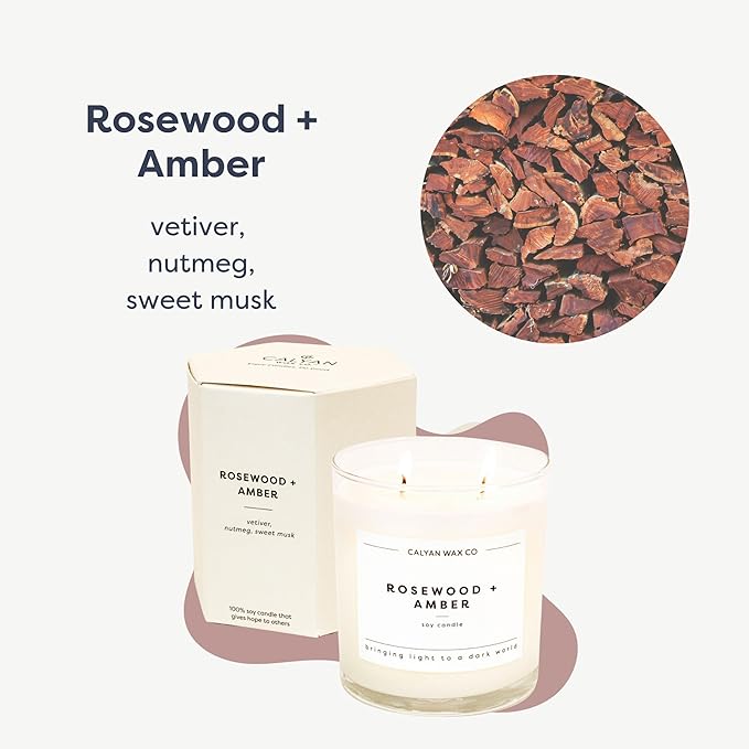 - ROSEWOOD & AMBER SCENTED CANDLE adds ambiance without overpowering. A warm & floral fragrance, nutmeg, lavandin grosso, and rosemary essential oils combine to fill your home with a luxurious aroma.