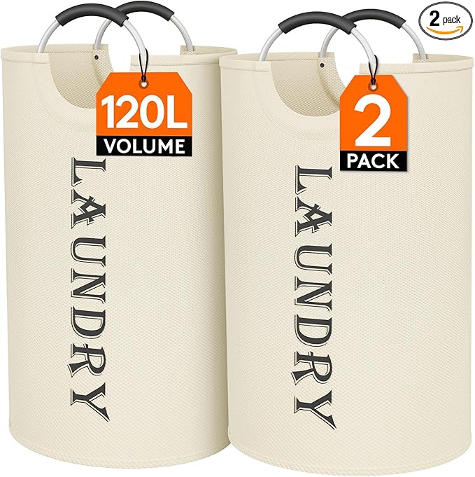 Lifewit 120L 2-Pack Large Laundry Basket, Collapsible Laundry Hamper with Aluminum Handles, Waterproof Freestanding Dirty Clothes Hampers for Laundry Room Bedroom Dorm Bathroom, White