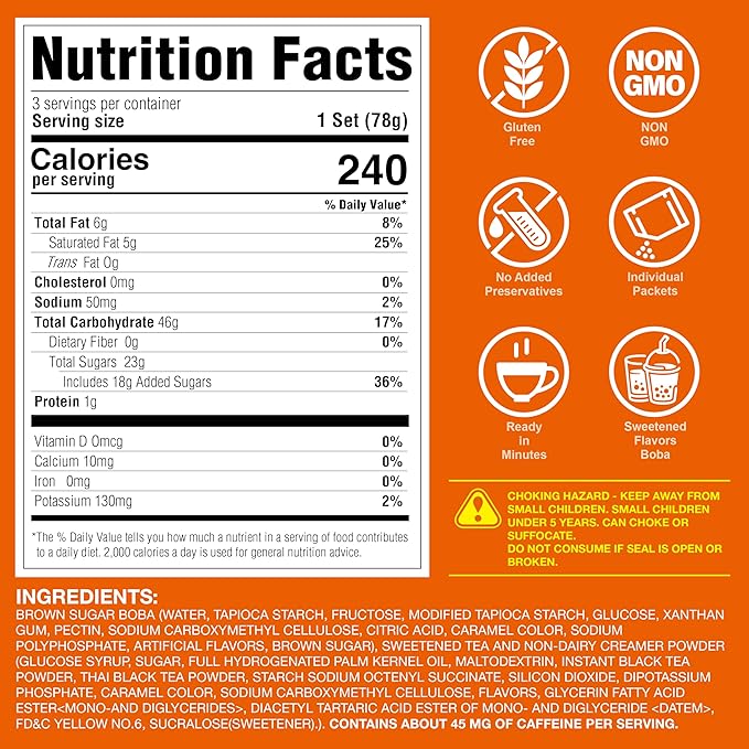 - WHAT IS INSIDE - 3 Individually wrapped portions of Brown Sugar boba, 3 thai milk tea packets, & 3 extra wide paper straws. Store in a cool, dry place (no refrigeration necessary).