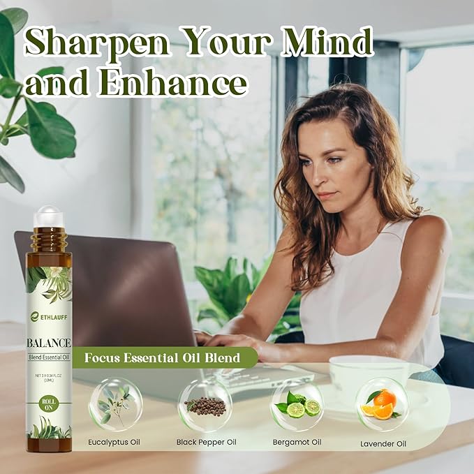 - Skin-friendly Essential Oil Blend Set: Achieve inner peace with our "Balance" formula, which combines soothing natural oils to help reduce stress and anxiety.The "Focus On" essential oil mix is designed to sharpen your mental clarity and boost concentration.The "Breathe" roll-on blend is expertly crafted to promote clear and easy breathing, making it perfect for those who seek relief from respiratory discomfort in a natural way.