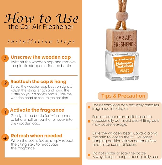 - 【Easy to Install, Adjustable Scent Strength】Our hanging essential oil diffuser installs in just three steps—remove the stopper, screw on the cap, and hang from your rearview mirror. Need a stronger scent? Simply tilt the bottle to let oil touch the wooden cap for an instant boost. The adjustable strap fits any car model without blocking your view, ensuring safe and comfortable driving.